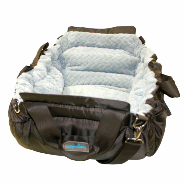 Napidoo Rectangular, Außen aus strapazierfähigem Nylon in Braun, innen hochwertiger, weicher Plüsch mit Zopfmuster in Eisblau.