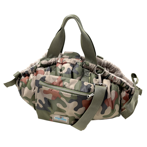 Hundekörbchen in Form einer sportlichen Tasche mit kleiner Außentasche.