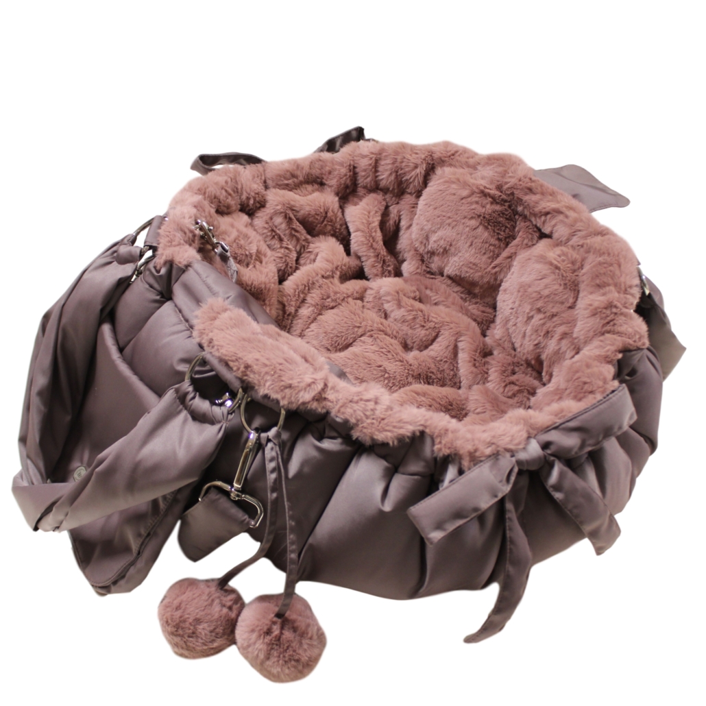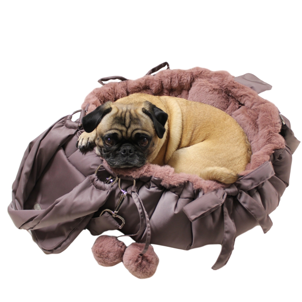 Der Style: Unser Taschenbett im aktuellen Farbtrend Mauve. Der modische Begleiter, der Sie und Ihren Hund stylisch ins Frühjahr bringt. Die Handtasche trägt sich durch die kurzen Stoffgriffe leicht am Arm und ist auch bequem schulterbar. Wie immer mit verstellbarem Schultergurt.